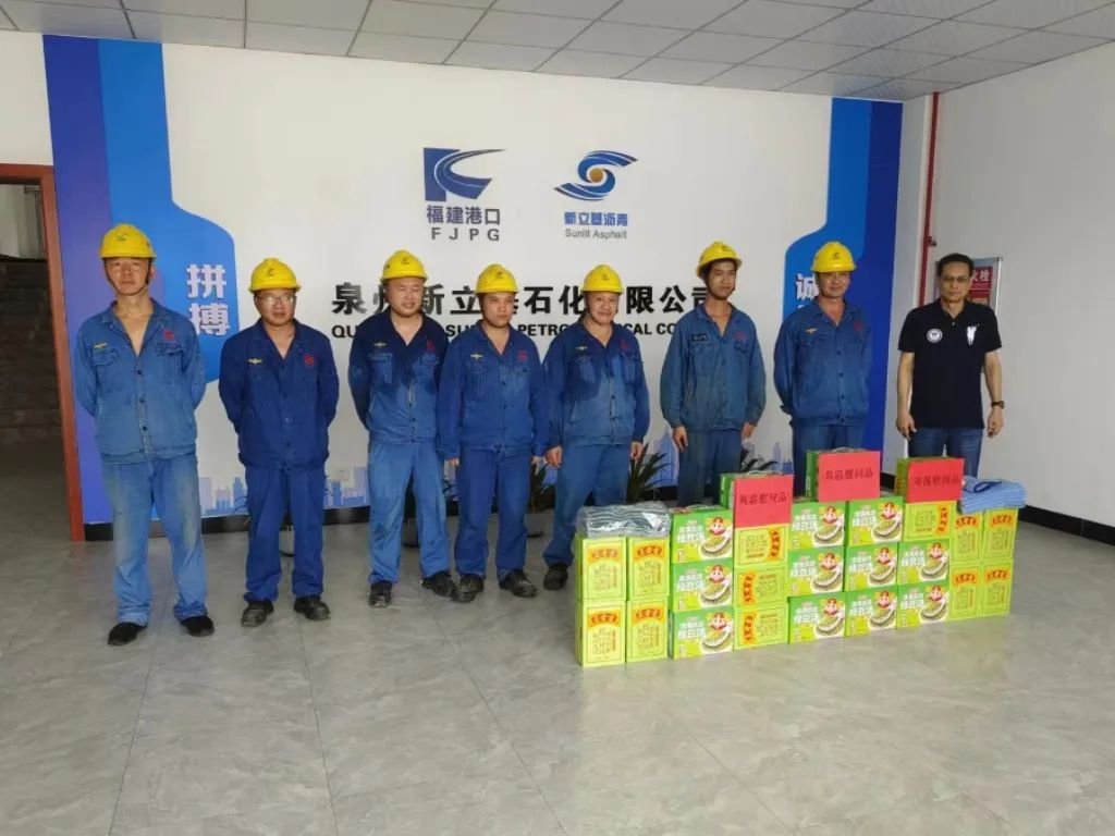 7月19日,厦门新立基副总经理吴稼民带队前往泉州新立基进行高温慰问。吴稼民深入沥青加工基地现场,详细了解防暑降温的情况,看望坚守在一线岗位的职工,为他们送上防暑降温用品,叮嘱大家在夏季高温作业时,要秉承“安全第一”的原则,注意防暑降温,把防暑降温工作和安全生产结合起来,合理安排工作和休息时间,确保生产经营工作顺利开展。