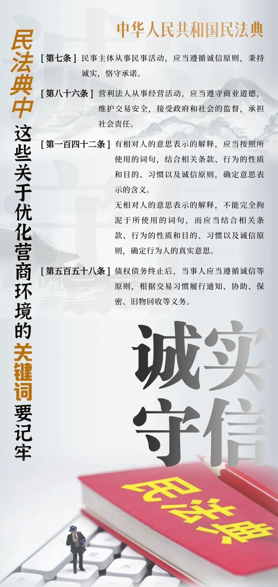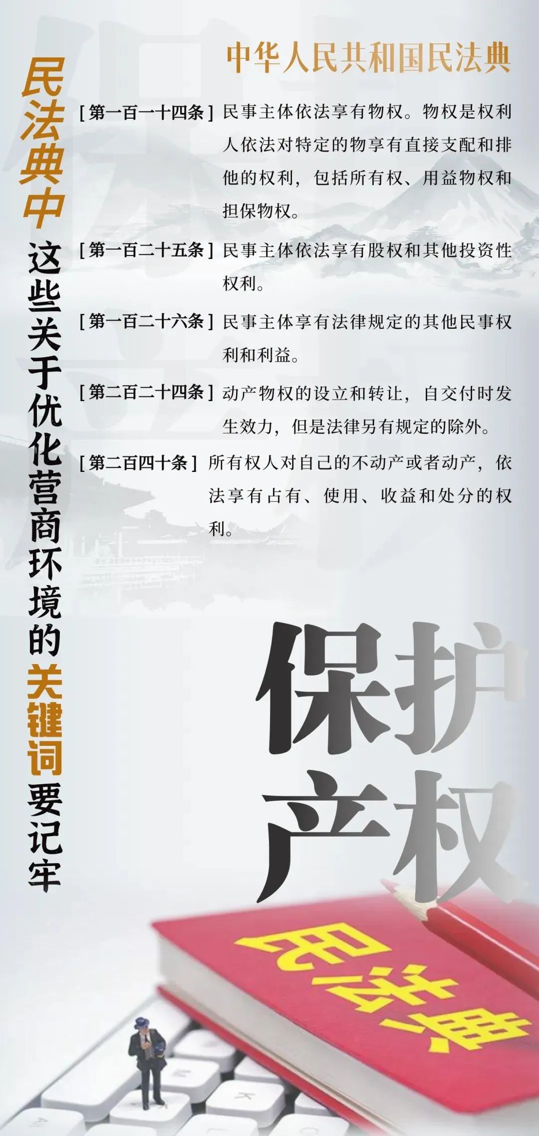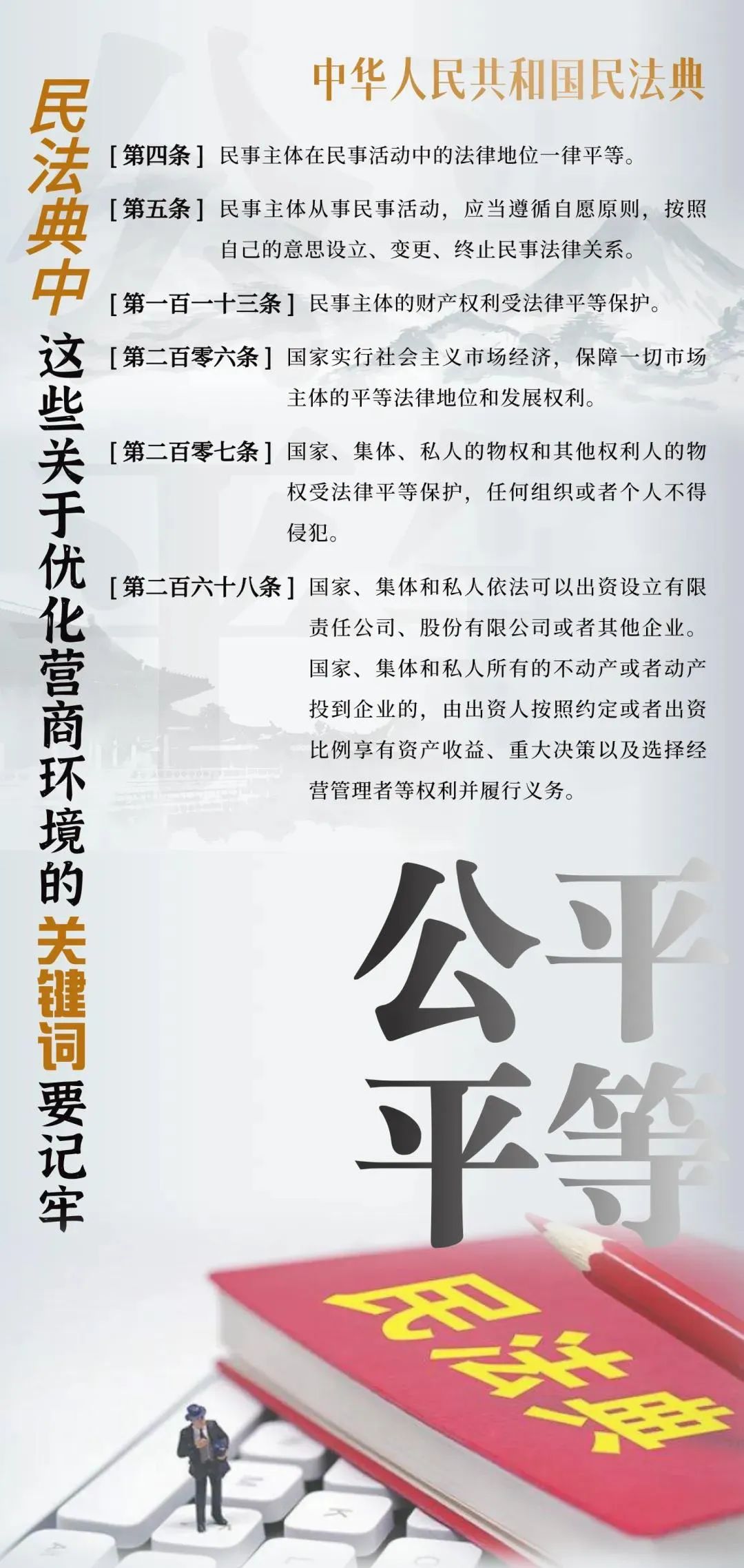 构建市场化、法治化、国际化营商环境,核心在于法治化。《中华人民共和国民法典》是我国民商事领域的基础性法律,为各类市场主体创造权利平等、机会平等、规则平等的营商环境。一组海报告诉你,哪些条款事关优化法治化营商环境。