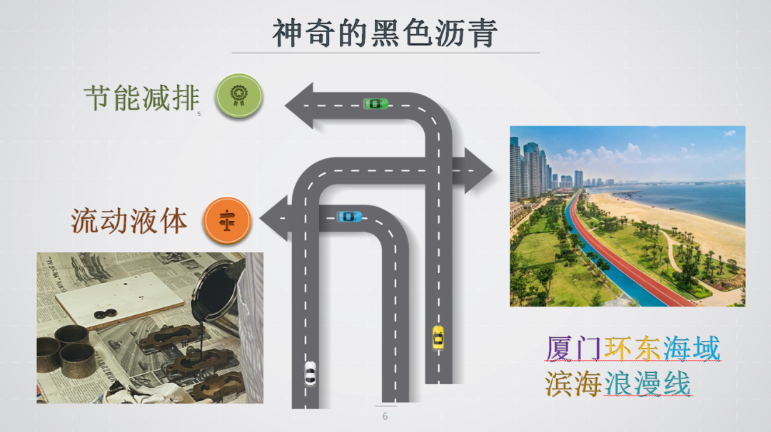 把自己关在黑色信息茧房中的我,在2022年参加了新员工轮岗计划,前往新立基沥青研发中心进行基层实践。看着黑漆漆的膏状化学物质,我眼前一黑,感到陌生且害怕。它的气味有些刺鼻,它有什么用?它是否有毒?怀着忐忑的心,我硬着头皮在研发专员的带领下开展了实验,从沥青的延伸度、软化点、针入度和弹性老化等方面入手,渐渐地我发现这抹黑,有点神奇。它可以是绿色,节能减排还提供更好的排水性能,循环再利用;它也可以是红色,在灼灼高温之下延展形态,变成液体灵活流动;它还可以是彩色,添加不同颜料后摇身一变,成为“厦门环东海域滨海浪漫线”的彩色步栈道!