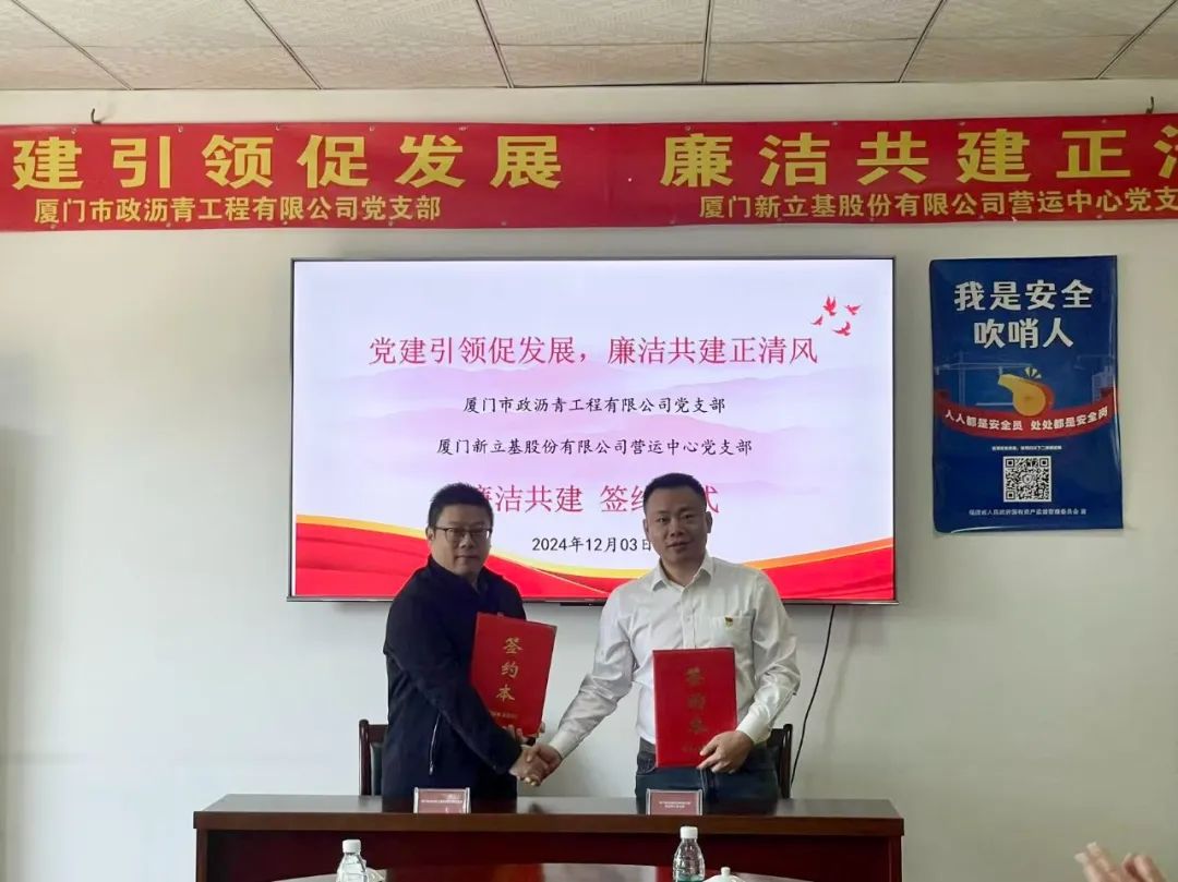 为深入学习贯彻习近平总书记在福建考察时的重要讲话和党的二十届三中全会精神,紧紧围绕“党建促业务、业务强党建”理念,系统推动党建与业务的深度融合。日前,厦门新立基营运中心党支部同厦门市政沥青公司党支部开展了“党建引领促发展 廉洁共建正清风”党建共建活动。新立基营运中心党支部书记、福建大区负责人吴建峰,厦门市政沥青公司党支部书记、董事长钟磊出席会议并签署共建协议。