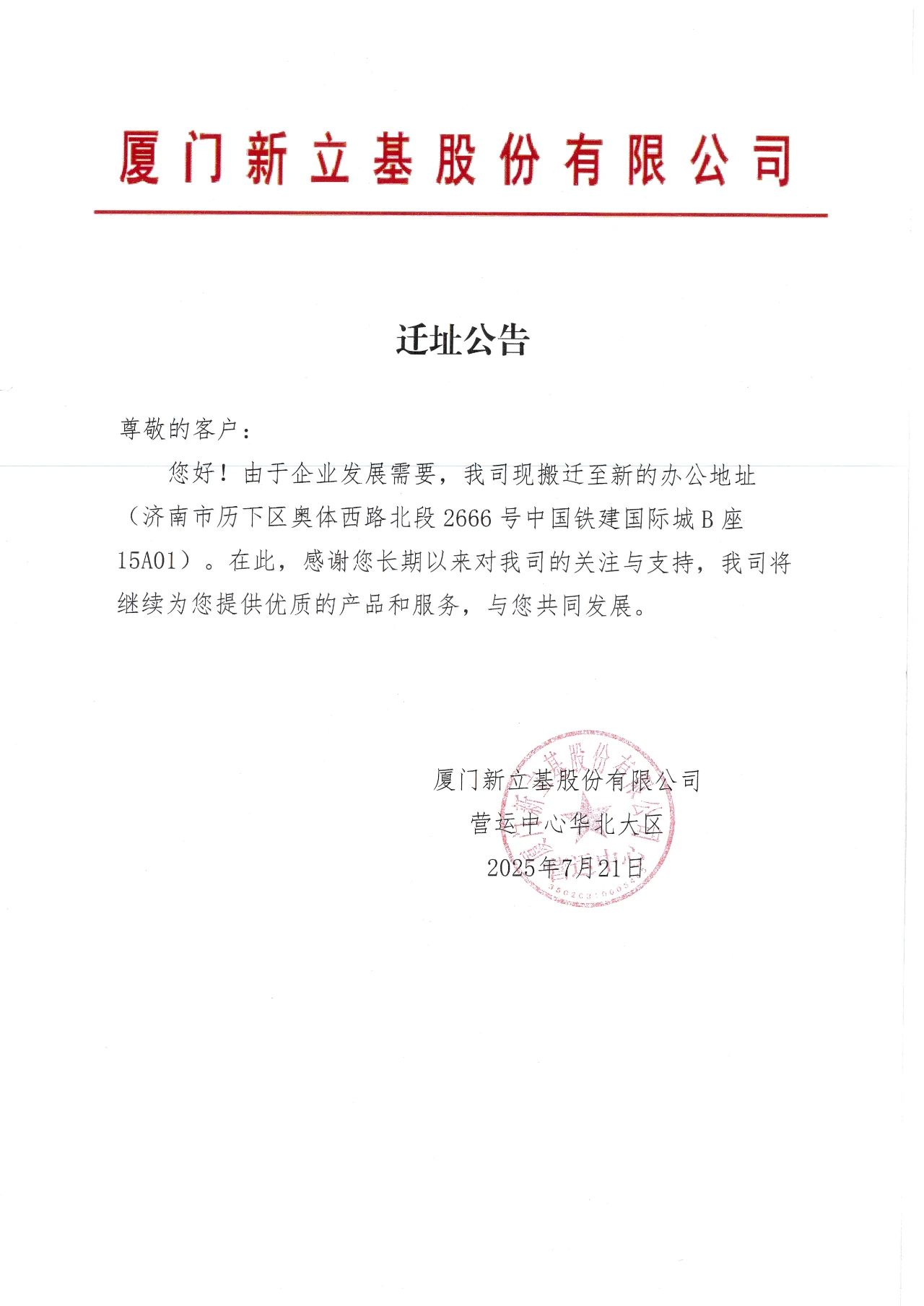 2025年7月21日上午,厦门新立基华北大区迁址揭牌仪式在济南市中国铁建国际城隆重举行。仪式简朴而热烈,公司党委书记、董事长林影,党委副书记、总经理连晓琪,总经理助理、营运中心总经理叶永杰亲临现场为新址揭牌,各大区班子成员、本部职能部门相关人员齐聚一堂,共同见证这一重要时刻。随着红布落下,华北大区正式翻开发展新篇章,全体员工将以新环境、新面貌迎接新挑战,为区域市场注入新活力。