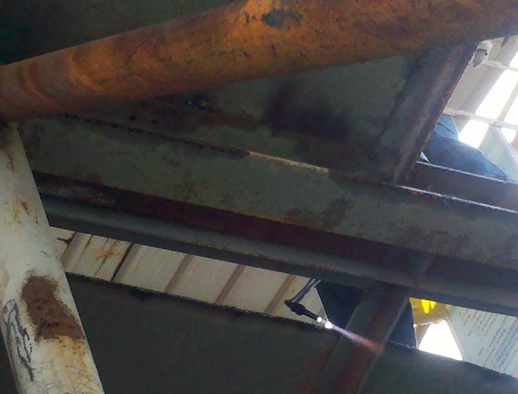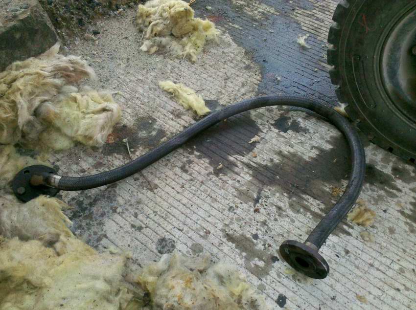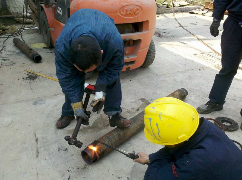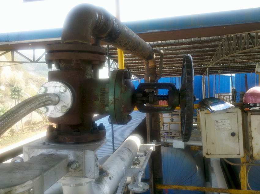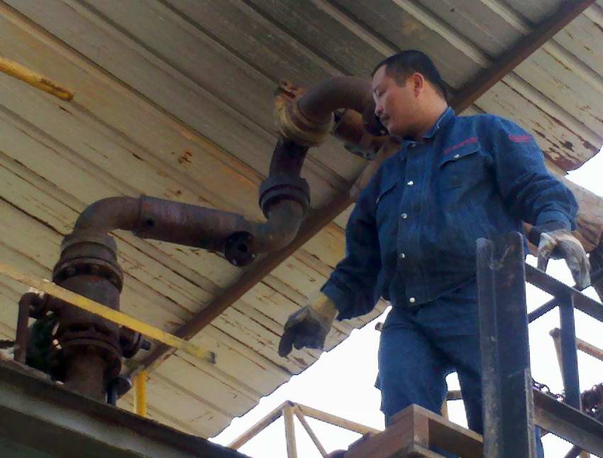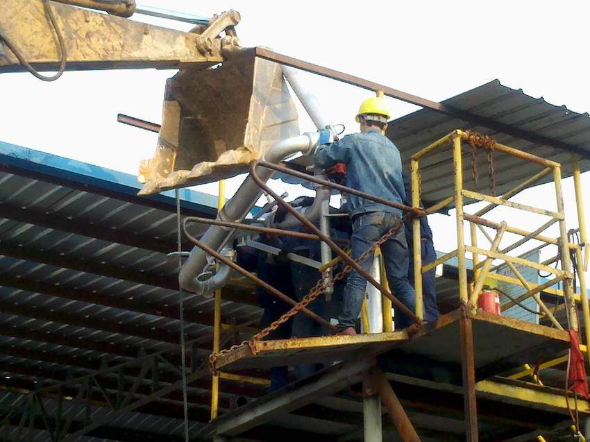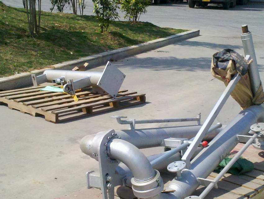 2013年3月7日至8日生产部对改性沥青发车平台更换发车鹤管。 使用挖掘机将新鹤管吊上发车平台进行组装,延长发车沥青管道连接鹤管。