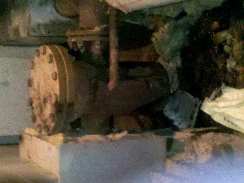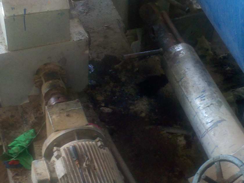 2013年3月11日晚6时巡查时发现2号生产罐沥青泵前过滤器漏导热油,当晚进行紧急处理。将保温全部拆开。   2013年3月12日晨将过滤器器拆除,发现底部焊接部位太薄,长期受压后从焊接处胀裂漏油。经生产部研究使用直通套管进行连接。下图为加工沥青管及焊接部位。