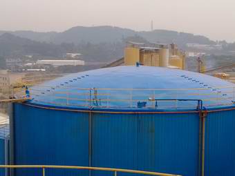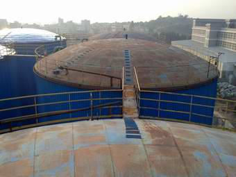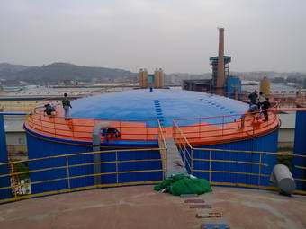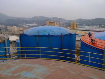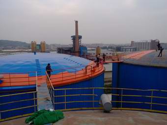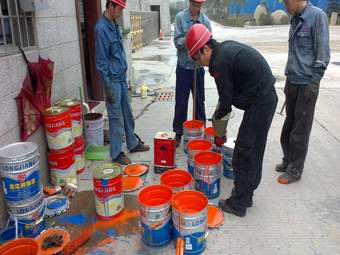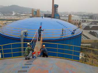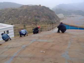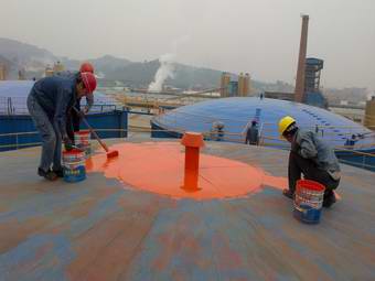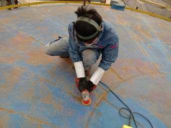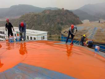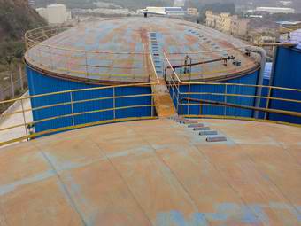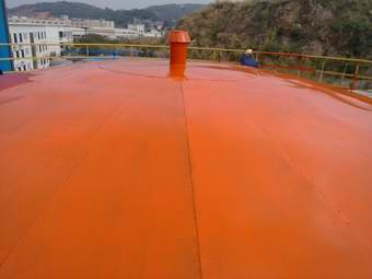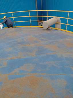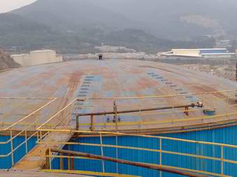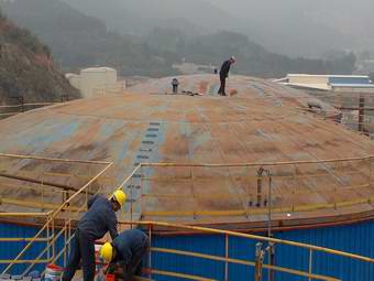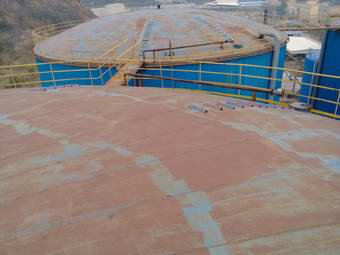 1月5日首先对1000T、500T罐顶部进行除锈上漆。下图:左边第一道红丹防锈漆,右边为第二道孔雀兰面漆后效果图