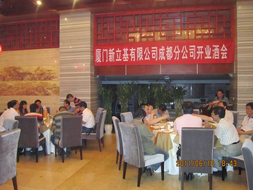 2011年6月18日晚18点30分成都天友国际酒店灯火辉煌,热闹非凡。厦门新立基有限公司成都分公司开业酒会在这里隆重举行。福建省交通建设投资有限公司党委书记、法人代表、厦门新立基有限公司董事长郭辉,福建省交通建设投资有限公司党委委员、副总经理、厦门新立基有限公司总经理朱勇进等领导,东莞、成都泰和沥青公司,四川翼龙、天龙,重庆锐天力及福建吉源、吉安、路港公司、江西赣北公司等来宾在签到簿上写上浓浓的祝福后围坐在一起。