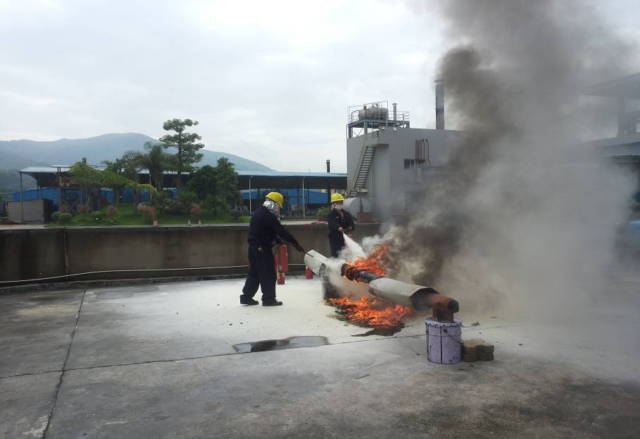 首先进行“导热油防泄漏应急演习”,演习背景是以生产区加温工作期间,高温管路突发泄漏导热油,浸油的保温岩棉自燃起火,进行扑灭为假想。通过演习让生产部员工在突发的事故面前能够正确实施救援,最大程度降低安全生产事故造成的危害。演习步骤要求准确到位,保障救火的同时,关注锅炉管路的应急处置、泄漏的导热油进行回收处置、沟井处导热油的防污染处理。