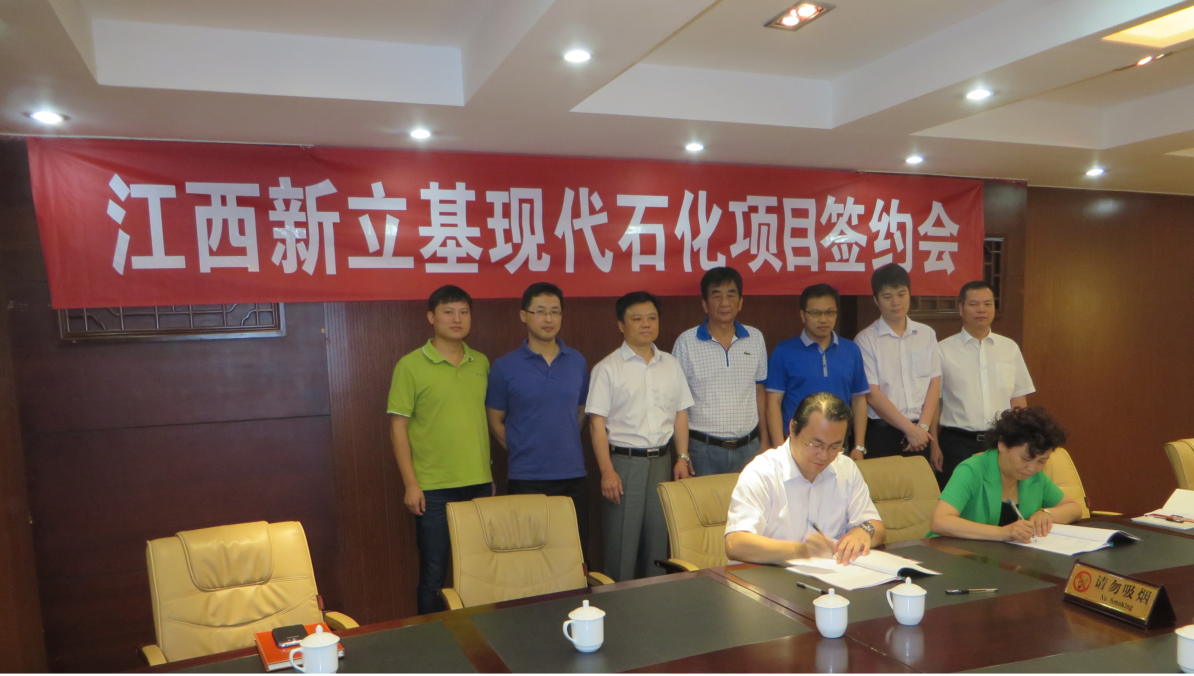 2014年6月18日上午9时,江西新立基现代石化项目签约会在九江宾馆二号会议室举行,市商管办副主任柳兴华、商资公司总经理汤晓燕、储运公司总经理李江林、新立基公司董事长王绪泉、副董事长兼法人朱勇进等领导出席本次会议。
