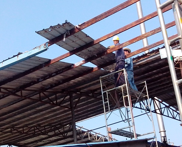本次整改人员从福州马尾库抽调方培龙、佘之洋两名机修人员回角美库参与整改。整改后在消防区储罐区周边消防阀门井用砖砌高15公分,防止雨水及砂土灌入;并在上面用彩板加盖防止雨水浇入同时为消防泡沫罐加顶棚防锈及消防泵房通气口加棚盖。此次生产区为本次整改的重点项目,在机修人员方培龙、佘之洋、王政、江明四位员工的带领下以及生产部其他员工的紧密配合,大家凭借自身的焊接工艺经验及搭棚知识自行购买材料,租赁脚手架,克服了炎热的天气,不畏辛苦修建了生产区备料杂物间、员工待工休息区以及更换生产区顶棚腐蚀的钢梁、彩钢板。 本次整改工程共耗时约1个月(从6月23日计划----7月17日完工)材料采购近2万元,目前已全部整改完成。此次的自建维修整改不仅节约了成本,而且消除了一定的安全隐患,为日后的安全生产提供了有力的保障。