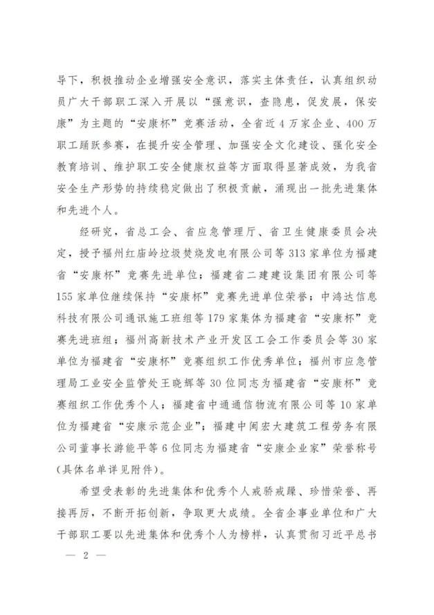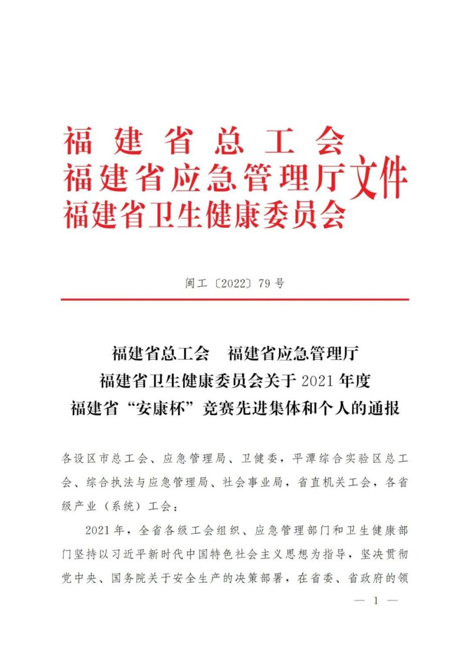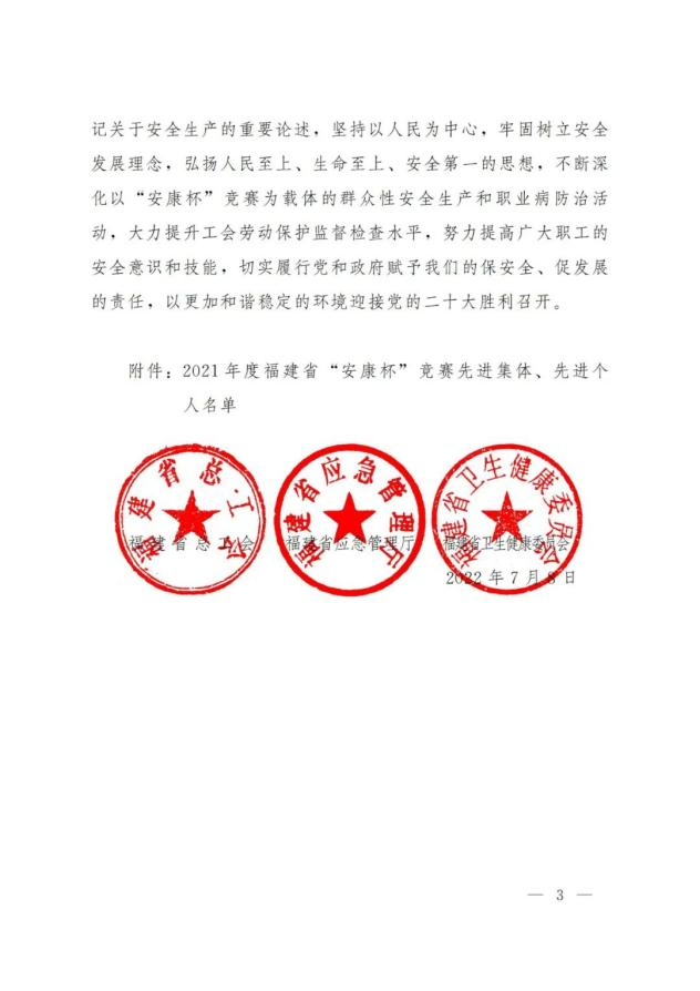 近日,福建省总工会、福建省应急管理厅、福建省卫生健康委员会联合印发《关于2021年度福建省“安康杯”竞赛先进集体和个人的通报》,球速手机在线官网荣获福建省“安康杯”竞赛先进单位荣誉。