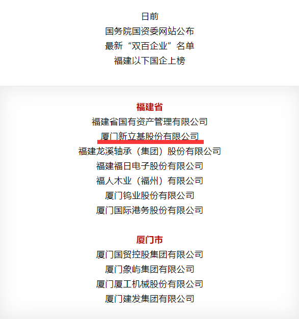 日前,国务院国资委网站公布最新“双百企业”名单,福建省共11家企业上榜,球速手机在线官网成功上榜。在此前结束的2021年度全国“双百企业”评估中,厦门新立基公司获评“优秀”等级。